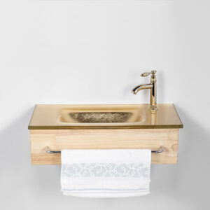 ארונית אמבטיה קטנה 30/60 ס״מ זהב עם כיור ברז ומראה