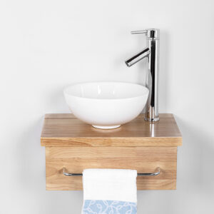 ארונית אמבטיה צרה 30/45 ס״מ עץ טבעי כיור ברז ומראה