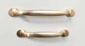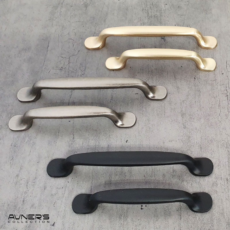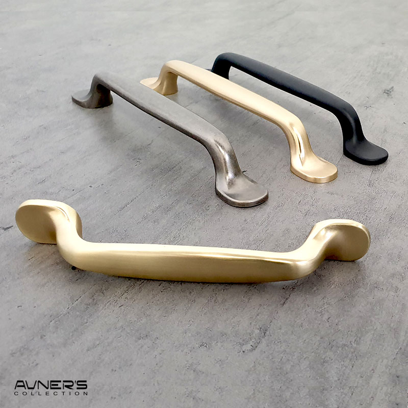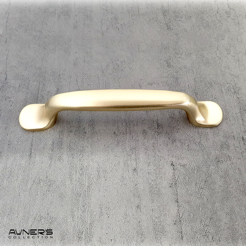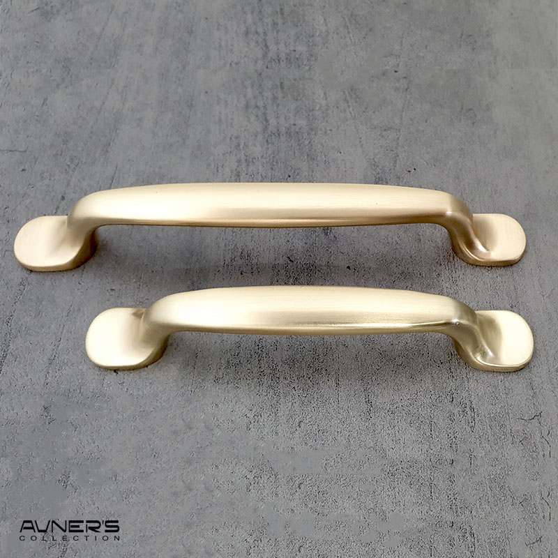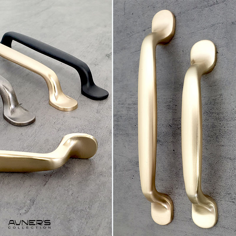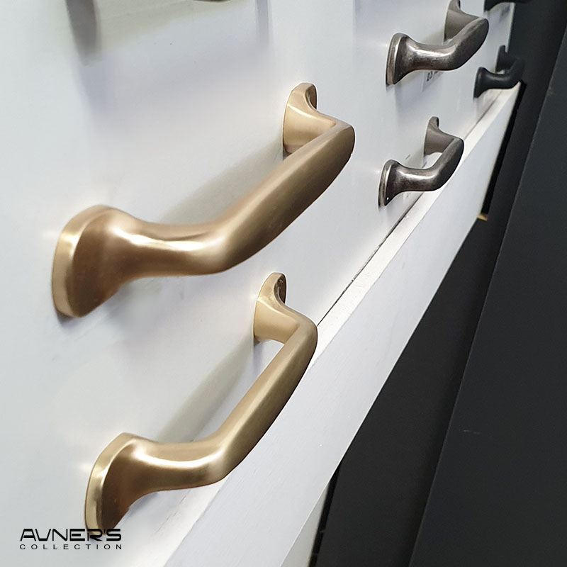 מבחר עשיר ידיות לריהוט בגימור זהב מוברש, ידיות זהב מט אפשר לשלב עם ידיות כפתור או ידיות קונכיה.