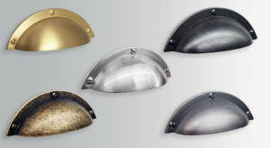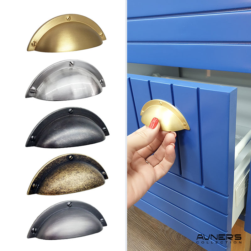 מגוון ידיות קונכיה לארונות ומגירות בגימורים שונים.