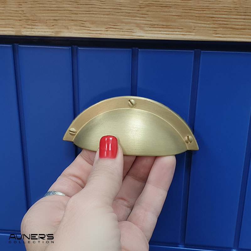 להרכבה על דלת או על מגירה של הרהיט. ניתן לשלב ידיות קונכיה עם ידיות במידות ארוכות או עם ידיות כפתור בגימור זהב מט.