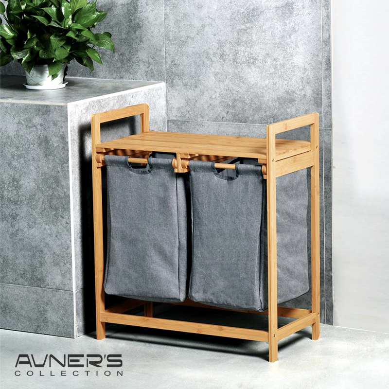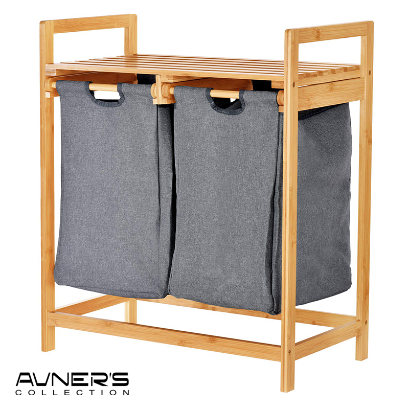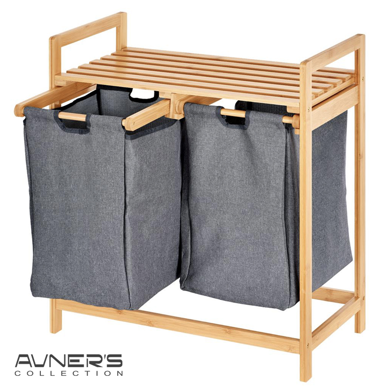- סל כביסה מחולק עם תאי הזזה בד ומדף עץ במבוק