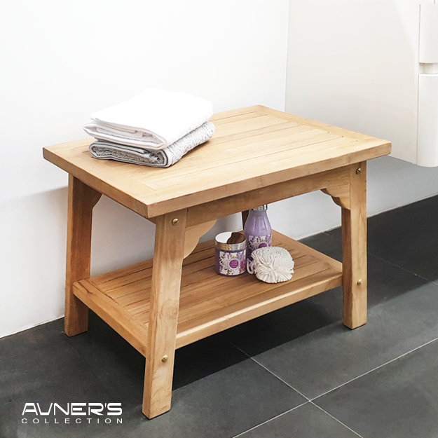 ספסל עץ למקלחת מלבני 60 ס״מ עם מדף עץ טיק מלא