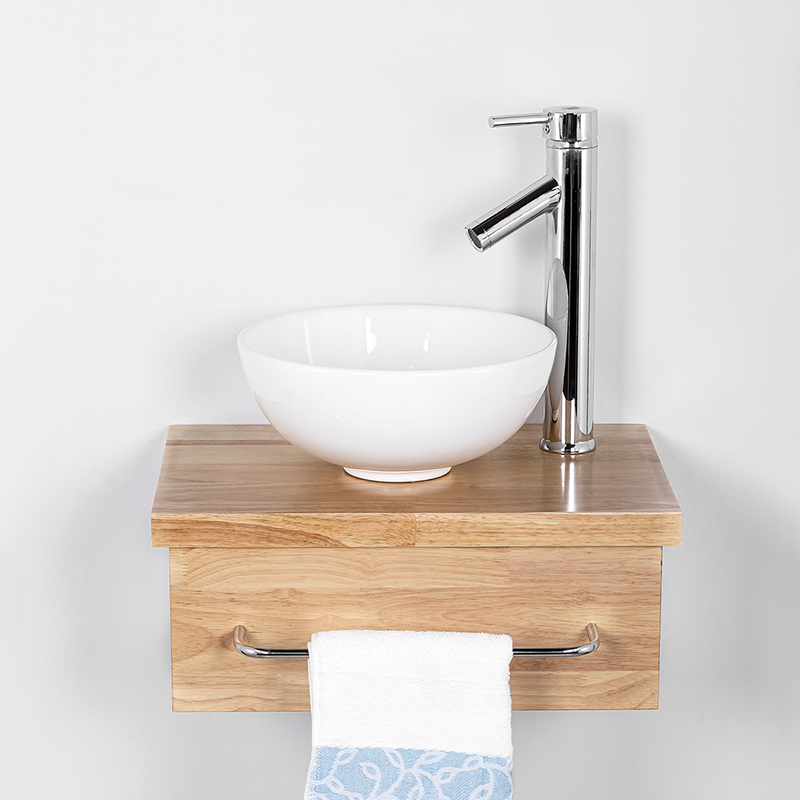 • ארונית אמבטיה צרה 45/30 ס״מ עץ טבעי, כיור ברז ומראה