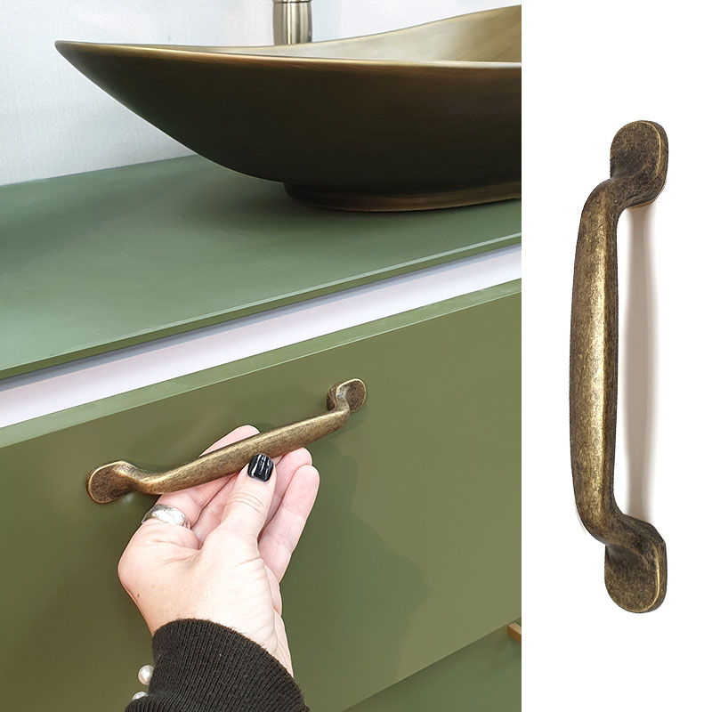 מבחר עשיר ידיות מעוצבות למטבח כפרי שניתן לשלב עם ידיות כפתור או ידיות קונכיה בגימור פליז עתיק.