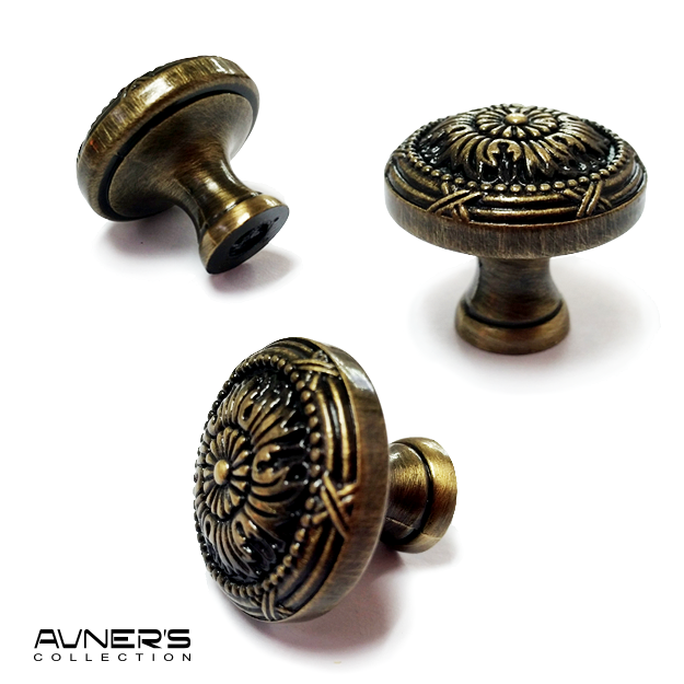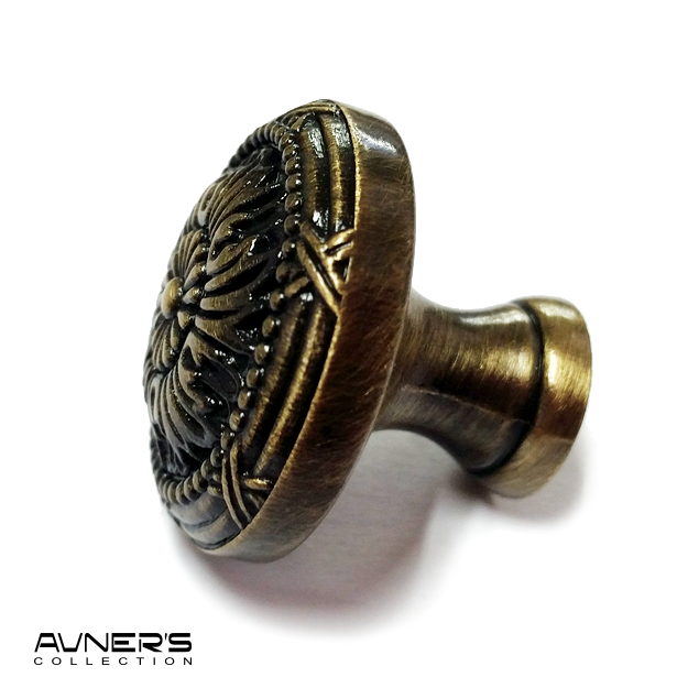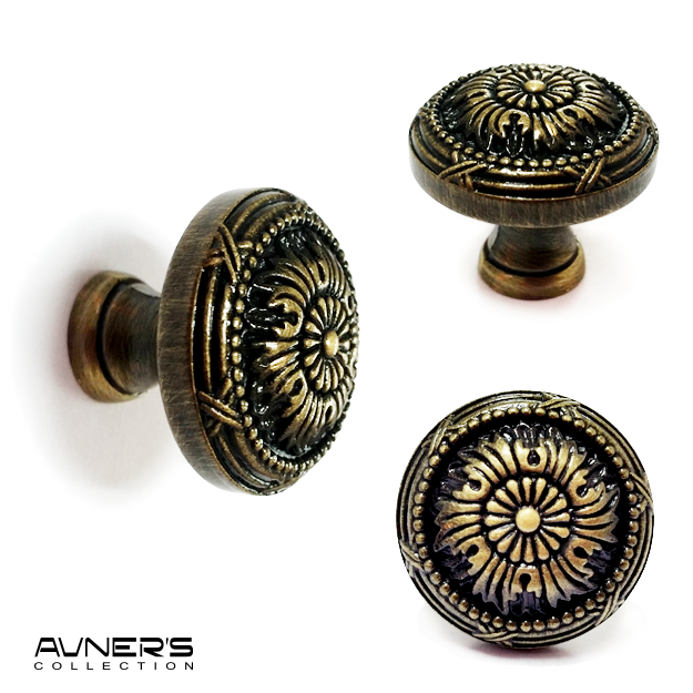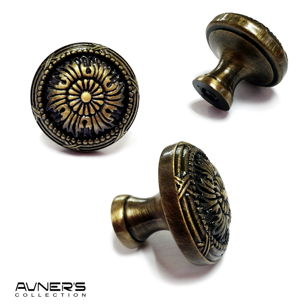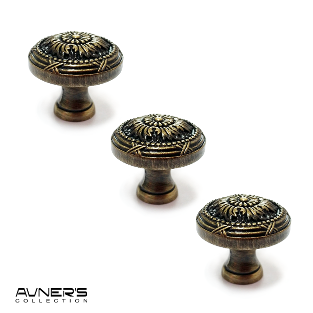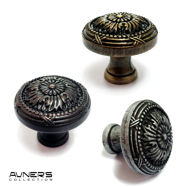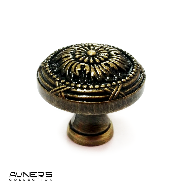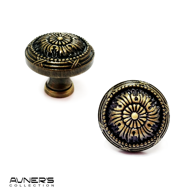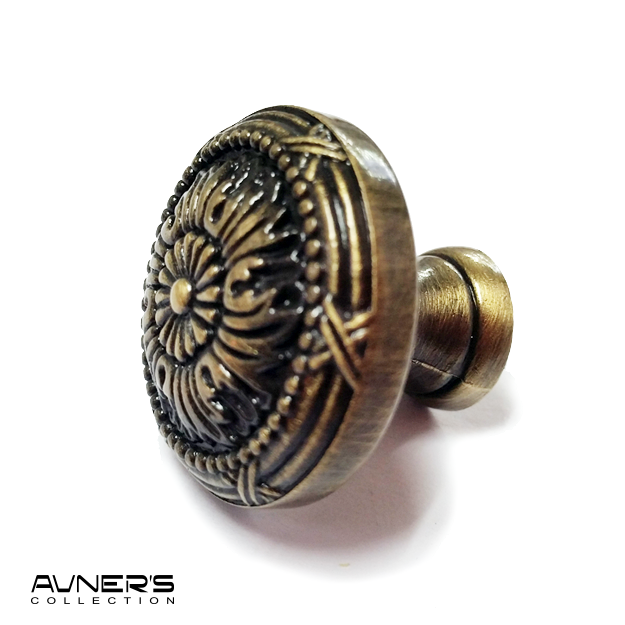 - ידית כפתור מעוצבת למגירות דגם 3127 קיימת ב-3 גימורים: ברונזה פליז עתיק / קופר מושחר / כסף עתיק מושחר