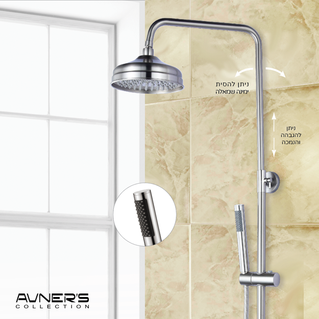- מערכת רחצה כוללת: מוט רחצה, ראש גשם, מזלף יד, צינור