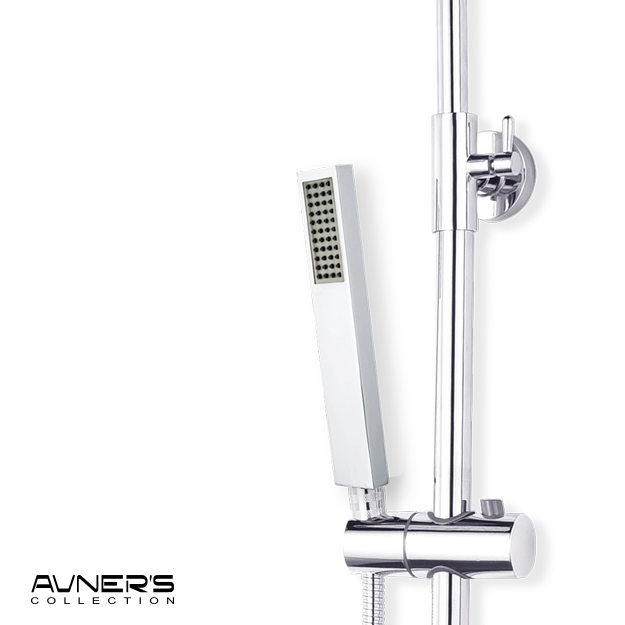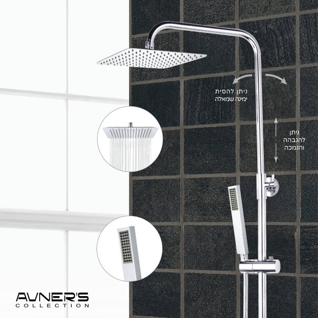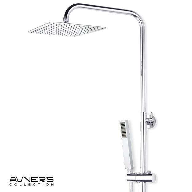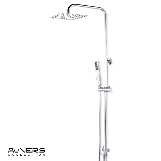 - כוללת: מוט רחצה, ראש גשם מרובע, מזלף יד מלבני, צינור