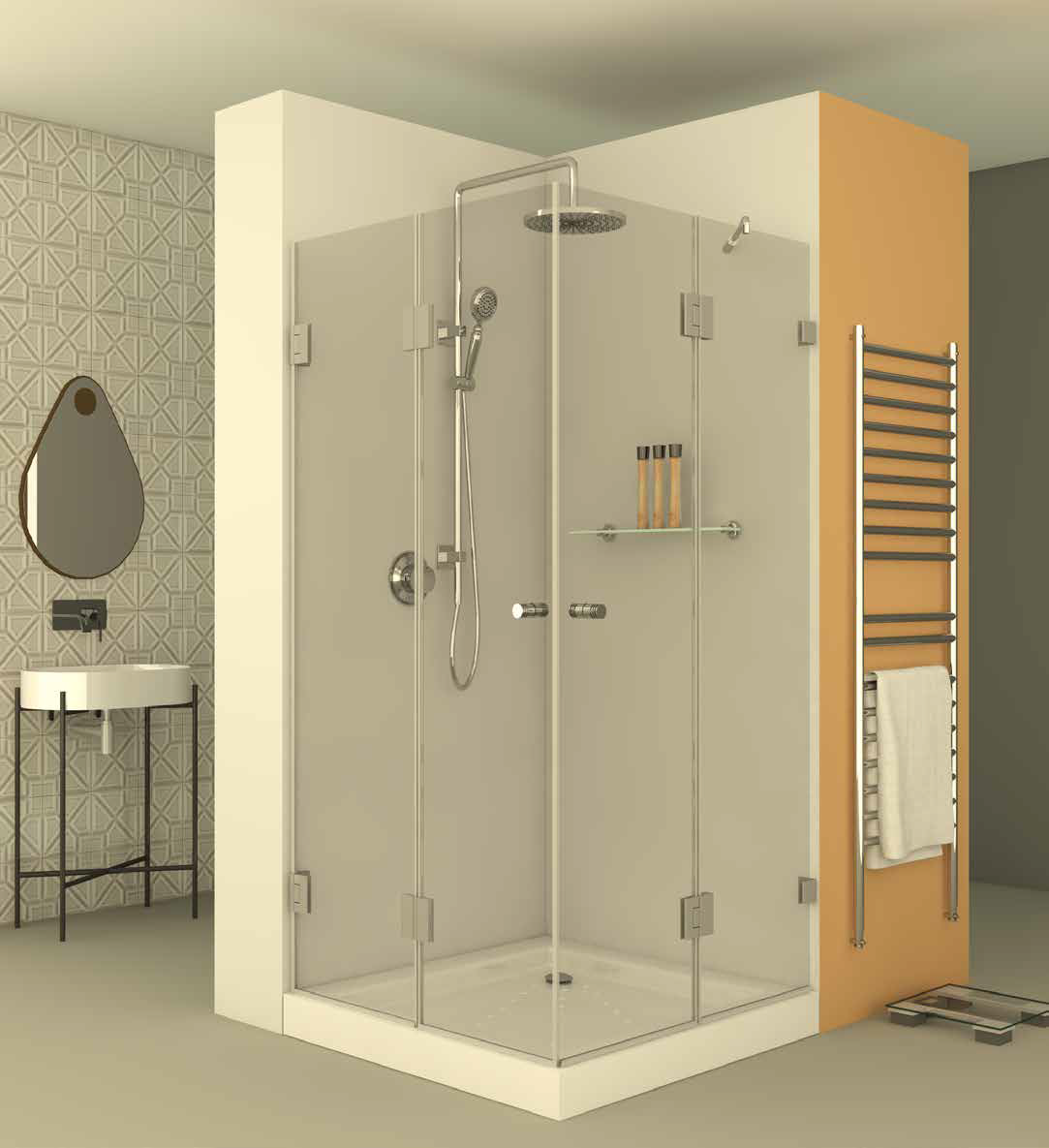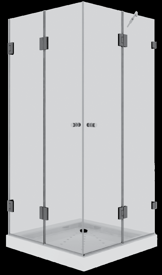 מקלחון square607 – מקלחון פינתי בעל חצי דופן קבועה וחצי דלת מצד אחד ומדלת הרמוניקה המתקפלת פנימה והחוצה מהצד השני