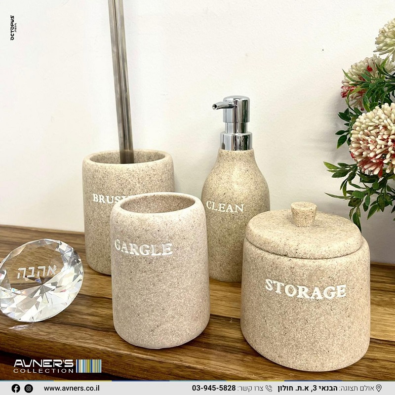 - מברשת אסלה, דיספנסר לסבון נוזלי, מעמד למברשות+משחות שיניים וצנצנת לקסמי אוזניים